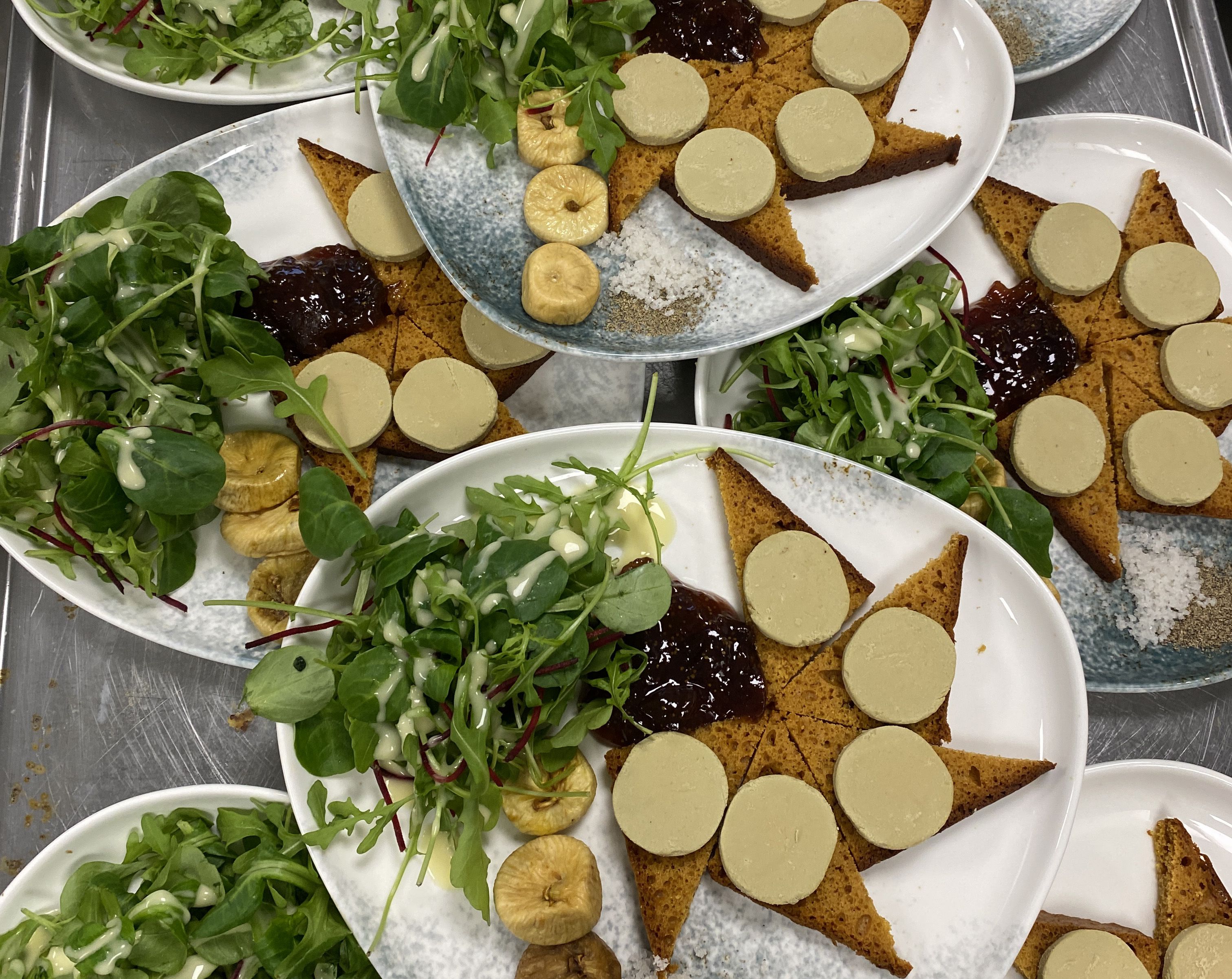Un festin raffiné : foie gras de canard, poulet farci aux cèpes et garnitures gourmandes, avant un final sucré d’assortiment de bûches.