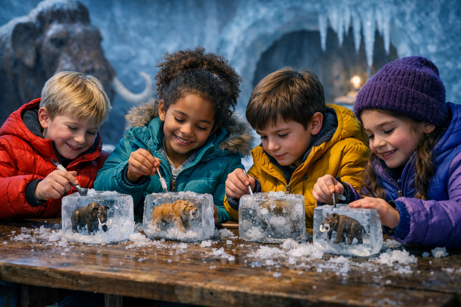 Armés de petits outils, les enfants deviennent de véritables explorateurs et libèrent de la glace des animaux emblématiques de la préhistoire, comme le mammouth ou le tigre à dents de sabre.